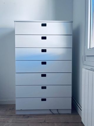 Zapatero extraíble de la marca Ikea, ideal para organizar tu calzado. - Diseño de dos niveles. - Acabado en color blanco. - Fabricado en metal resistente. - Incorpora guías para extracción suave. Sin abrir el embalaje. Se vende porque compramos dos y solo cabe uno en el armario. Ver medidas en fotos: 75x58. En medidas del producto se indican medidas del paquete embalado.