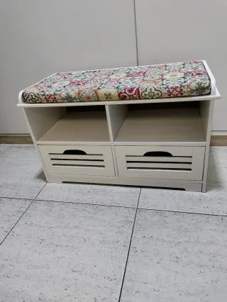 Para poner zapatos, almacenaje y sentarse. Se pueden poner patas. Para baño, pasillo o habitación. Se ve en una foto tiene la madera quebrada,(ver foto)no afecta al producto. Alto 46 cm. Largo 60 cm. Fondo 30 cm aproximadamente. Precio no negociable.