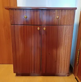 Mueble de madera con un diseño clásico y elegante. Medidas: 72, 5 cm (ancho) x 26 cm (fondo) x 79 cm (alto) - Dos cajones superiores con tiradores dorados. - Dos puertas inferiores con tiradores dorados. - Acabado en tono caoba.