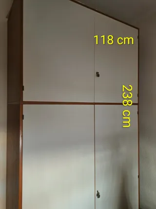 Armario de gran capacidad con altillo, por dentro cajoneras y ropero estanterías, ideal para organizar tu ropa y pertenencias. - Medidas: 118 cm de ancho x 238 cm de alto. - Diseño con puertas blancas y detalles en madera. - Con llaves para cerrarlos. Mira el perfil hay mesita y zapatero de conjunto para vender separado.