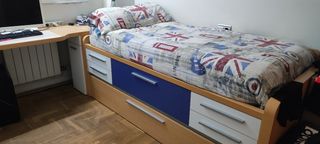 REGALO ESCRITORIO Y ESTANTERiA DE ARRIBA TAMBEN VENTA POR SEPARADO Mueble de dormitorio juvenil con un diseño funcional y moderno. Ideal para organizar el espacio. - Estructura de madera clara. - Cajones integrados para almacenamiento. Cama de 90 x190 90€ Estanteria 30€ Zapatero 20€ Modulo Estante,con cajones 50€ Sinfonier 50€