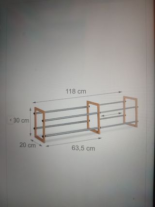 Zapatero extensible, con ancho ajustable para adaptarlo al espacio disponible, de 63 a 118 cm. Fabricado en madera y barras de acero. Tengo dos, 20€ cada uno