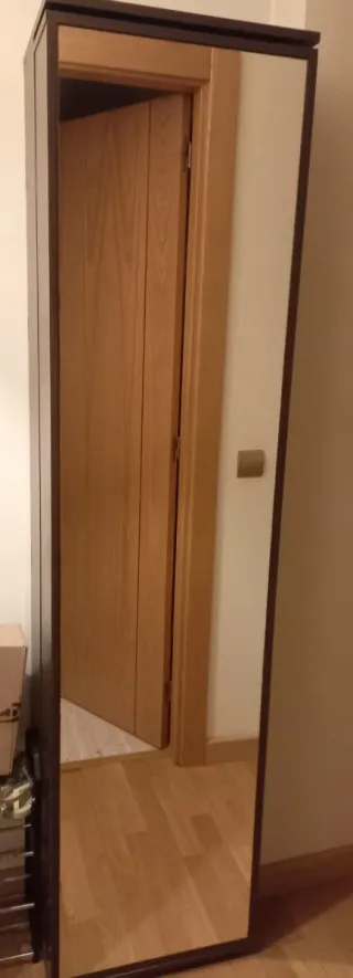 Zapatero alto con estructura de madera y puertas de espejo de igual medida. Se necesita furgoneta para cargar. - Medidas aproximadas de 2 metros de alto, 30x50 aproximadamente. Pesa mucho, puertas dobles. - Diseño elegante y funcional. - Medidas aproximadas.