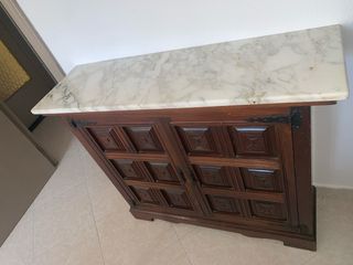 Mueble taquillón con superficie de mármol y estructura de madera. - Diseño con puertas talladas. - Barras zapatero (útiles, pero oxidadas) - Acabado en tonos marrones. - Pequeños desperfectos Hay que bajarlo de un 3º sin ascensor y pesa.