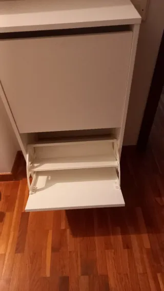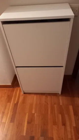Mueble zapatero de Ikea con un diseño moderno y funcional. - Dos compartimentos abatibles para guardar calzado. - Acabado liso y fácil de limpiar.