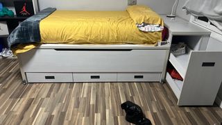 Mueble juvenil tipo nido en perfecto estado. - Ideal para dormitorios juveniles. - compuesto por armario tres puertas con altillo, dos altillos de dos puertas cada uno, una estantería librería, zapatero, mesita con ruedas de dos cajones, escritorio y cama con dos grandes cajones