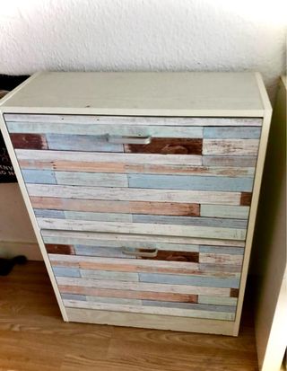 Zapatero con un diseño de listones de madera en varios tonos, ideal para organizar hasta 10 pares de zapatos. Su estructura combina materiales para mayor durabilidad. - Diseño de listones de madera multicolor. - Capacidad para 10 pares de zapatos.