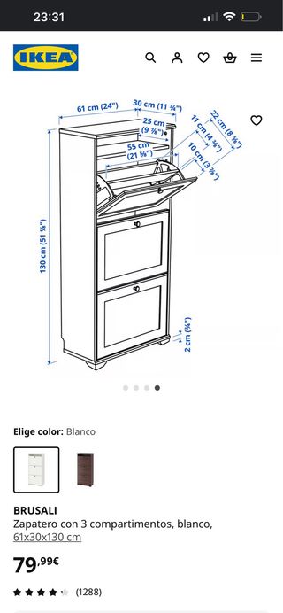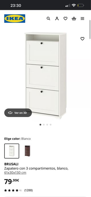 Zapatero BRUSALI de IKEA con tres compartimentos. - Color blanco. - Diseño moderno y funcional. - Medidas: 61x30x130 cm.