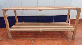 Zapatero o miniestante de madera con los 2 fallos que se ven en imagen (por eso, el precio está reducido, para colocar cosas ligeras como zapatos.Ideal si la quieres también restaurar. 63×26×28 Si compras 2 artículos, se hace 10% descuento!
