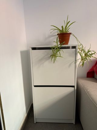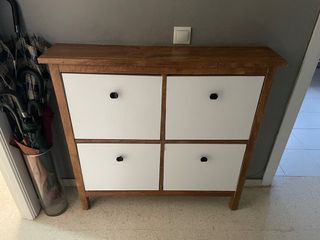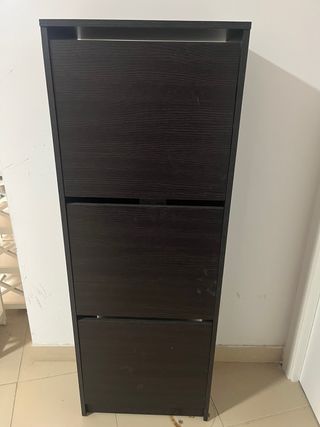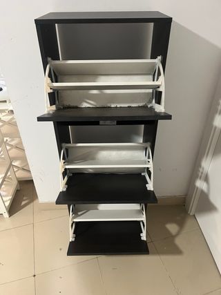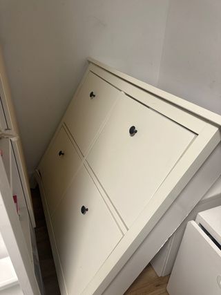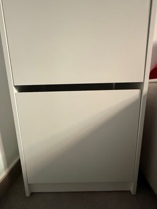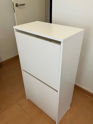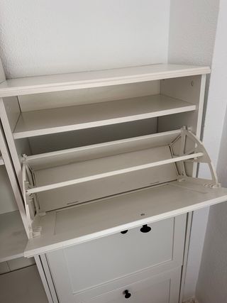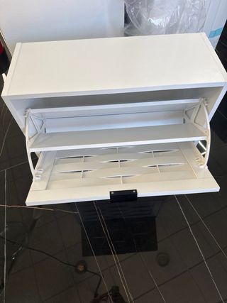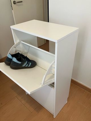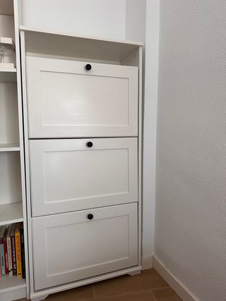 Mueble zapatero de la marca Ikea con un diseño moderno y funcional. - Tres compartimentos abatibles para almacenar zapatos. - Tiradores negros para un contraste elegante. - Acabado en color blanco.