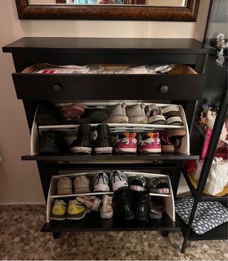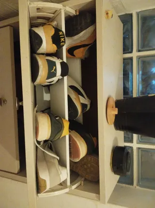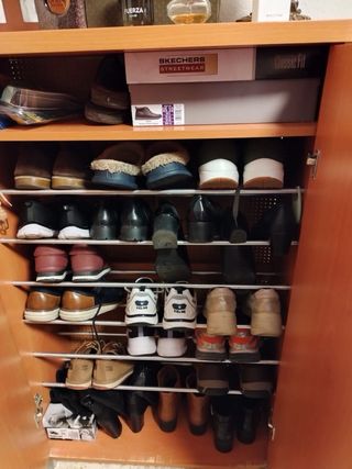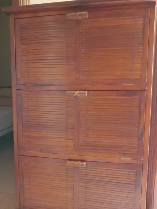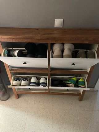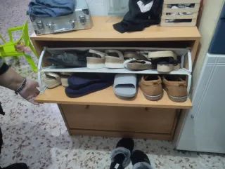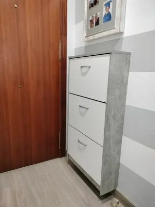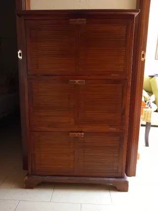 Vendo zapatero en muy buen estado, ideal para mantener todos tus zapatos bien organizados y a mano. 🪵 Características: • Ancho: 76 cm • Alto: 123 cm • Color madera • Varias baldas interiores con gran capacidad (caben muchos pares) • Puertas abatibles para mantener el interior protegido del polvo 👟 Perfecto para entradas, pasillos o dormitorios. Diseño sencillo que combina fácilmente con cualquier estilo. 💰 Precio: 40€ 📍 Recogida en mano. 📩 Interesados, escribir sin compromiso.