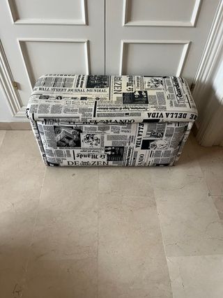 Zapatero con un diseño original y llamativo, cubierto con un estampado de periódicos. - Estampado de periódicos en blanco y negro. - Tapizado en tela.