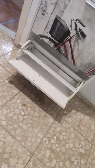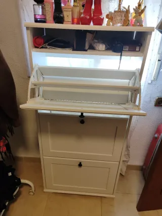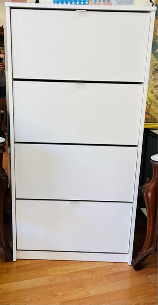 Zapatero blanco muy cómodo y sencillo. - Diseño moderno y funcional. - Dos baldas para organizar calzado. Medidas: -93 cm de alto -49 cm de ancho -28 cm de fondo Solo venta en persona, gracias.