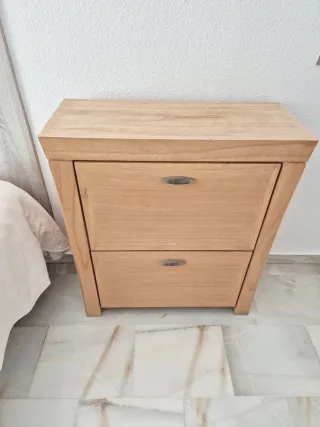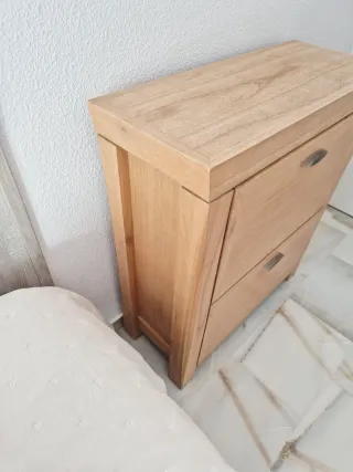 Mueble zapatero con un diseño moderno y funcional. - Acabado en madera natural y maciza, (no es aglomerado ni melamina) - Dos compartimentos amplios para zapatos. - Tiradores metálicos. SOLO recogida en casa en Sevilla Éste