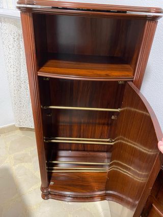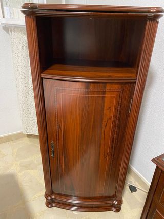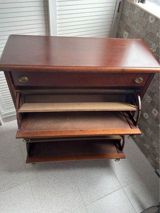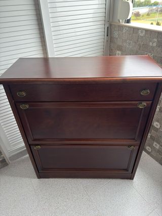 Mueble zapatero de estilo clásico. - Diseño elegante con múltiples compartimentos. - Acabado en tono madera oscura. Medidas: 95 cm de alto, 90 cm de ancho y 33,5 cm de fondo la base superior. ! PRECIO NO NEGOCIABLE ¡