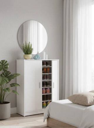 Mueble organizador de calzado con un diseño moderno y funcional. Perfecto para mantener tus zapatos ordenados. - Acabado en blanco y detalles en madera. - Puertas frontales para ocultar el contenido. - Múltiples estantes para una gran capacidad.