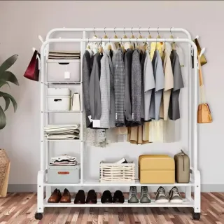 Este perchero y zapatero combina funcionalidad y diseño. - Estructura de metal resistente. - Tres niveles de estanterías para zapatos. - Múltiples ganchos para colgar ropa.