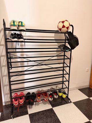 Zapatero de gran capacidad para organizar tus zapatos. Su diseño es moderno y funcional. - Estructura de metal resistente. - Múltiples niveles para almacenar calzado. - Color negro y detalles multicolor.