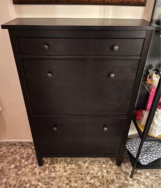 Zapatero de la serie Hemnes de Ikea en acabado negro-marrón. - Diseño de tres cajones. - Tiradores redondos. Algunos desperfectos fácilmente subsanables (fotos).