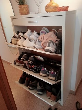 Mueble zapatero de madera con tres puertas abatibles. Gran capacidad ,depende como pongas el calzado de caben 3 o 4 pares . A juego con el perchero. Hago precio si te llevas el conjunto. - Diseño moderno y funcional. - Ideal para organizar el calzado.