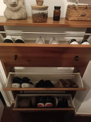 Mueble zapatero de IKEA con un diseño moderno y funcional. El zapatero tiene marcas de uso como puedes apreciar, y el último cajón habría que arreglarlo. De ahí el precio. - Tres compartimentos para organizar tus zapatos. - Tiradores negros para un contraste elegante. - Acabado en madera.