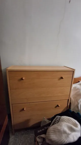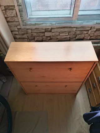Mueble de madera con dos cajones, ideal para organizar calzado. - Diseño sencillo y funcional. - Tiradores redondos de madera.
