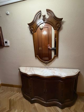 Elegante y espacioso zapatero de madera natural con encimera de mármol veteado de muy alta calidad. Se entrega espejo a juego de madera natural también. Medidas del recibidor 1,50 ancho y 30 de fondo. Espejo, 120 de alto 60 de ancho. Recogida en parquesol. Precio no negociable.