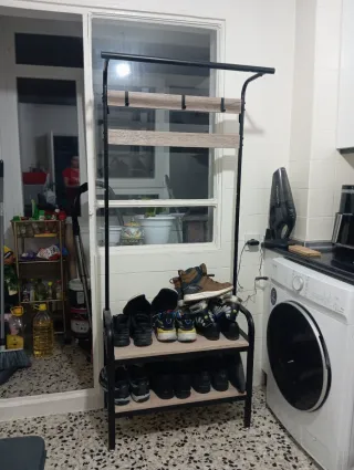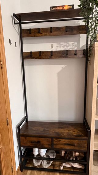 Mueble de entrada funcional con un diseño moderno y práctico. - Estructura metálica resistente. - Tableros de madera con acabado rústico. - Incluye ganchos para colgar abrigos. - Estantes para zapatos en la parte inferior. - Estante superior para objetos decorativos o de uso diario. Recoger en persona. La entrega se hace en A Coruña.