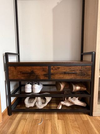 Mueble perchero y zapatero de diseño moderno. Solo 2 meses de uso. Resiste peso de varias piezas de ropa o zapato, y cajas de almacenamiento. - Estructura combinada de metal y madera. - Dos baldas inferiores para zapatos. - Asiento superior para sentarse o aprovechable para almacenaje - Dos cajones para almacenamiento. - Barra superior para colgar abrigos. Con ganchos de metal extra