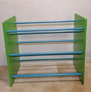 Mueble zapatero de metal y madera Medidas: Ancho 66cm Fondo 30cm Alto 60cm Para 9 pares de zapatos, incluso más... Las barras azules son de metal y están bien. Luego la madera color verde, como se ve en las fotos, necesita una reparación para quedar en perfecto estado.