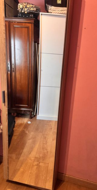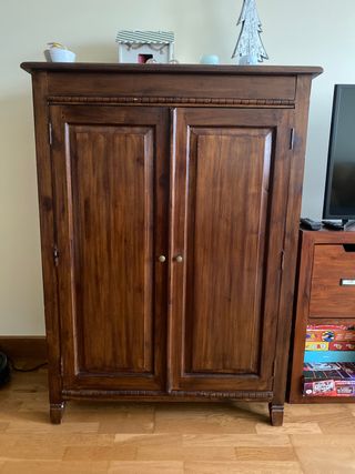 Armario madera de Banak Importa, en perfecto estado. Tiene 4 cajones cerrados, un cajón abierto y, adicionalmente, un cajón “secreto”. En las puertas, perchas para corbatas y pañuelos. En la parte inferior, zapatero. Solo recogida.