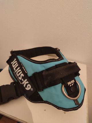 Precioso arnés de la talla M de Julius K9. Está en perfecto estado quitando una muesca que tiene la correa del pecho y que puede cambiarse/reforzarse sin problema en un zapatero o en casa.