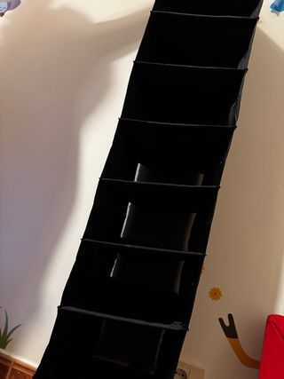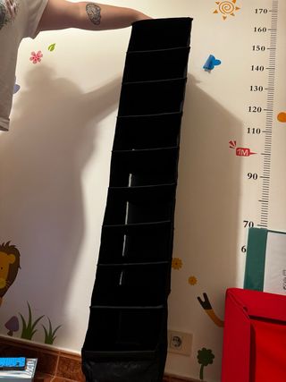 Organizador de tela negro para zapatero u otros usos. Está en muy buen estado y es perfecto para organizar el calzado o cualquier otra cosa que necesites guardar. - Tiene 10 baldas espaciosas. - Es de tela resistente y fácil de limpiar. - Ideal para guardar zapatos, ropa, juguetes, etc.