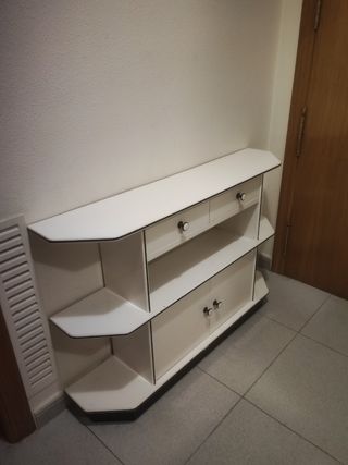 Mueble recibidor de madera, ideal para la entrada. Se encuentra en buen estado y listo para usar. - Dos cajones en la parte superior. - Dos puertas en la parte inferior que puedes utilizar como zapatero o como tú prefieras. Tiene algunas señales de uso pero está en buen estado, es de madera lacada en blanco roto. Medidas: Fondo 24,5 cm Ancho 110 cm Alto 72 cm