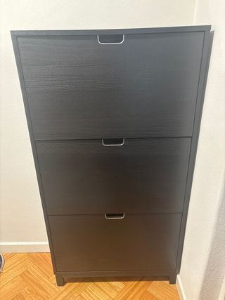 Zapatero de madera con gran capacidad para organizar hasta 24 pares de zapatos. - Diseño moderno y funcional. - Acabado en color negro. - Modelo Stall de Ikea valorado nuevo en 159€ (Viene sin los zapatos)