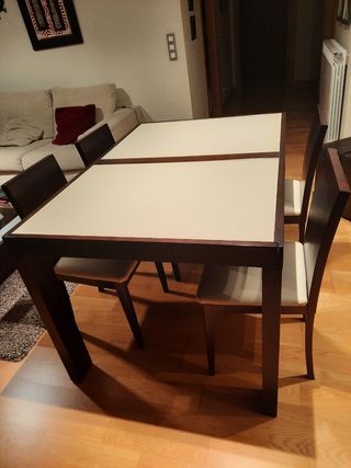 Mesa de comedor de 135x90 extensible hasta 217cm (se puede extender a la medida deseada con tope en 217cm). Madera color Wengé y cristales color laca Beig. Muy facil de extender. Tiene una persiana y es muy cómodo, solo hay que tirar. También se incluyen 4 sillas de madera color Wengé y tapizado color beige claro. Una esquina de un respaldo de una silla tiene un pequeño toque que se aprecia en una de las fotos. Está muy bien cuidado y es de muy buena calidad Mueble zapatero y baldas a juego anunciados en mi perfil.