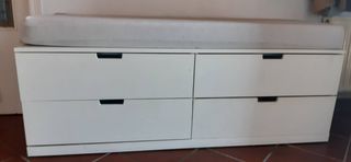 Cómoda zapatera de Ikea, en color blanco y fabricada en madera. Tiene cuatro cajones espaciosos. Es perfecta para organizar el calzado y ofrece un asiento cómodo. Regalo una espuma con funda para poner en la parte superior. Costó 249 € y lo vendo por 98€. Precio no negociable.