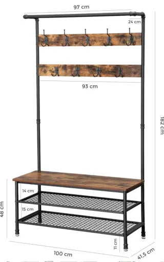 Práctico perchero con zapatero, ideal para organizar tu entrada. - Estructura robusta de metal. - Superficie superior de madera con acabado rústico. - Dos niveles de rejilla para zapatos o cestas.