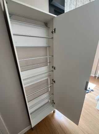 Zapatero de color blanco con espejo de cuerpo entero en la puerta frontal. Diseño elegante y funcional, ideal para colocar en el dormitorio, vestidor o entrada. Tiene capacidad para almacenar numerosos pares de zapatos gracias a sus estantes interiores con barras metálicas. La puerta se abre lateralmente y permite un acceso cómodo a todo el contenido. Muy práctico y ocupa poco espacio. ✨ Color blanco ✨ Medidas: 192cm de alto / 59cm de ancho / 22cm de profundidad / 13cm las patas ✨ Detras es abierto a la pared, no tiene lamina