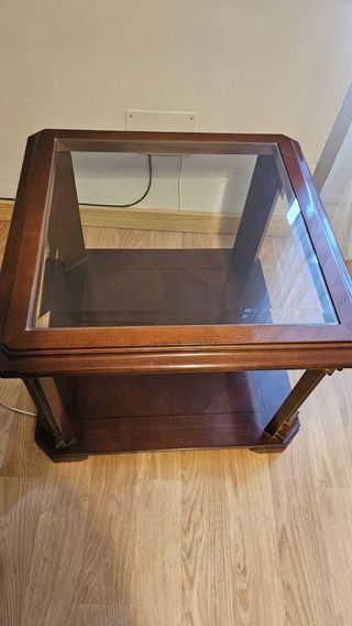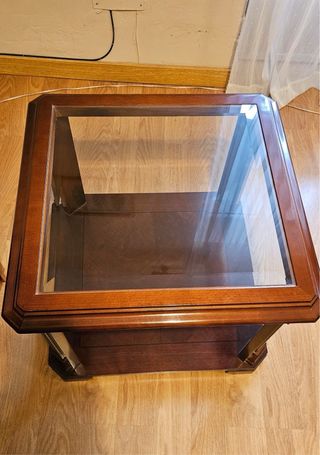 Elegante mesa auxiliar con un diseño clásico y funcional. Perfecta para cualquier rincón de tu salón. - Acabado en madera oscura. - Superficie de cristal transparente. -58,5 cms ancho * 44 cm alto