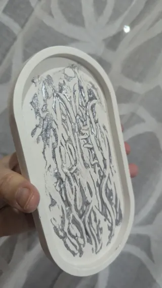 Bandeja decorativa con un diseño abstracto y elegante. Su acabado combina tonos plateados sobre una base blanca, aportando un toque moderno a cualquier espacio. - Diseño con relieve texturizado. - Forma ovalada. - Ideal para colocar pequeños objetos decorativos. Hecha de yeso y acrílicos. Acabado con barniz para darle el toque brillante