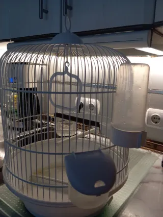 Jaula redonda para pájaros con columpio, bebedero, comederos y dos palos para posarse. Desinfectada pero hay manchas en el suelo de la jaula que no consigo quitar MEDIDAS : Alto:37cm aproximadamente