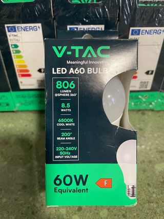 Lote de 10 bombillas LED V-TAC modelo A60. - 806 lúmenes. - Equivalente a 60W. - Luz blanca fría (6500K). - Ángulo de haz de 200°. - Voltaje de entrada: 220-240V, 50Hz.