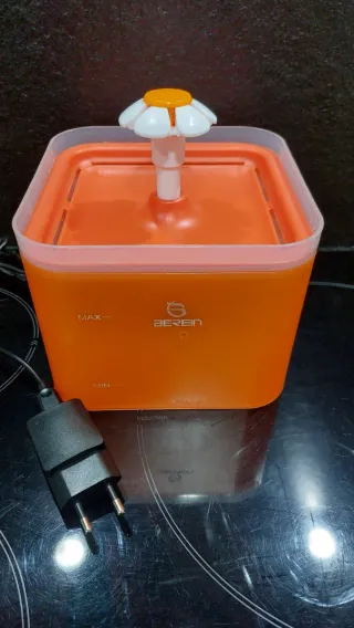Fuente de agua automática para gatos de la marca Berein. Su diseño en forma de flor es atractivo y funcional. LA BOMBA NO FUNCIONA BIEN, HABRÍA QUE CAMBIARLA,PERO LA FUENTE ESTÁ BIEN CUIDADA. - Color naranja. - Indicadores de nivel MAX y MIN. - Incluye adaptador de corriente.
