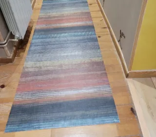 Alfombra de PVC con un diseño de rayas en varios colores. Es una pieza decorativa y práctica para el hogar. - Diseño de rayas horizontales. - Patrón abstracto y moderno. En perfecto estado. Medidas 225 cm de largo x 78 cm de ancho. Marca Vilber, es buena marca, costó nueva 75€ en Amazon