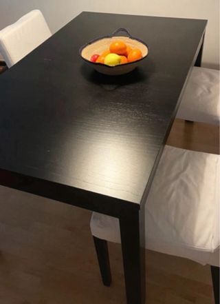Conjunto de mesa de comedor 90x90 extensible a 1,80x90 ,con seis sillas. La mesa esta practicamente nueva, muy poco uso - Mesa con superficie de madera y estructura metálica. - Sillas con asiento y respaldo acolchados.