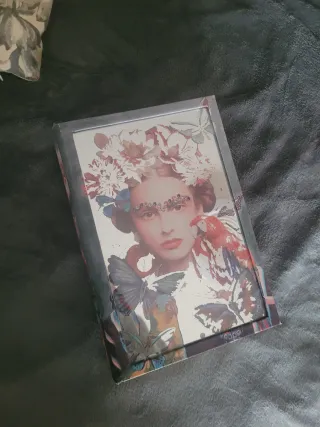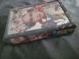 Este libro o caja presenta un diseño inspirado en Frida Kahlo, con un estampado vibrante y detallado. - Ilustración de Frida Kahlo con flores y mariposas. - Diseño artístico y colorido. - El frente tiene el fondo como de espejo