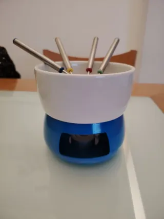 Set de fondue con un diseño moderno y elegante, perfecto para compartir momentos especiales. - Cuenco de cerámica blanca. - Base exterior azul - Incluye 4 pinchos de metal con detalles de colores. - se pone una vela debajo
