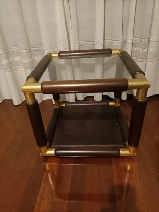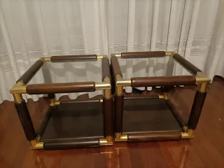 Conjunto de dos mesas auxiliares con un diseño moderno y elegante. - Estructura de madera con detalles dorados. - Tablero superior de cristal. - Tablero inferior de madera. - Patas y bordes de madera. - Algo desgastado por el uso, pero en buen estado.