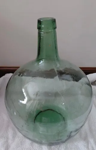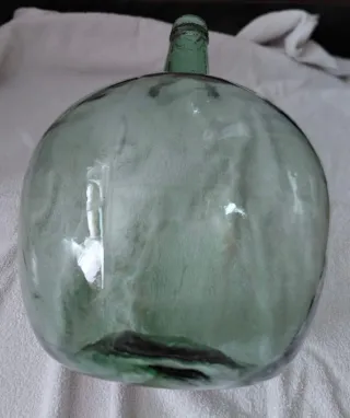 Damajuana de vidrio de color verde. Ideal para decoración o coleccionismo. Medidas: - Perimetro: 1,08m - Altura: 45cm. - Peso: 3,600kg.